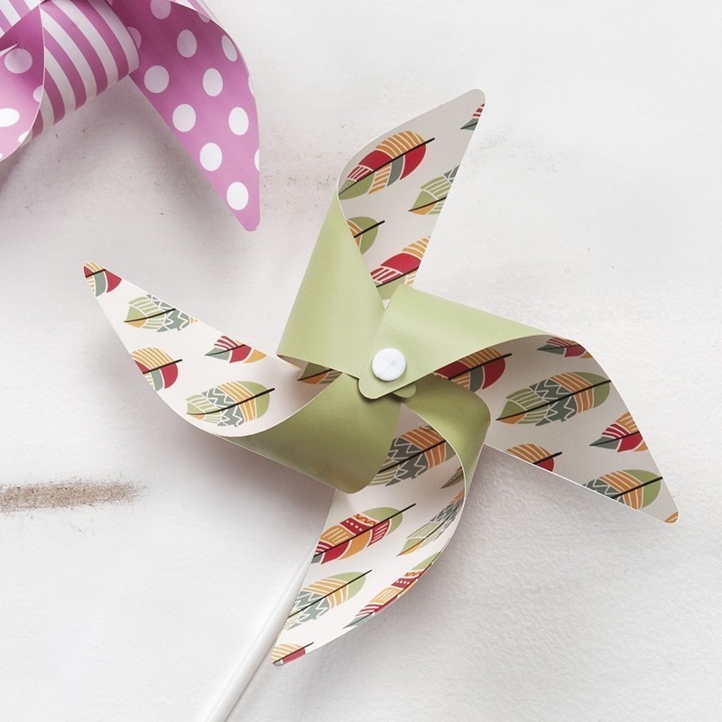 Χάρτινος διακοσμητικός ανεμόμυλος με πλαστικό stick. Print διπλής όψεως σε ethnic αποχρώσεις με παραστάσεις από φτερά. Ελάχιστη παραγγελία 25 τεμάχια.