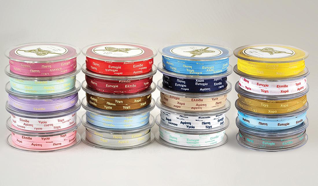 Κορδέλα γκρο μονόχρωμη με μονόχρωμη εκτύπωση μεταξοτυπίας, με ευχές και ούγια στο τελείωμα.