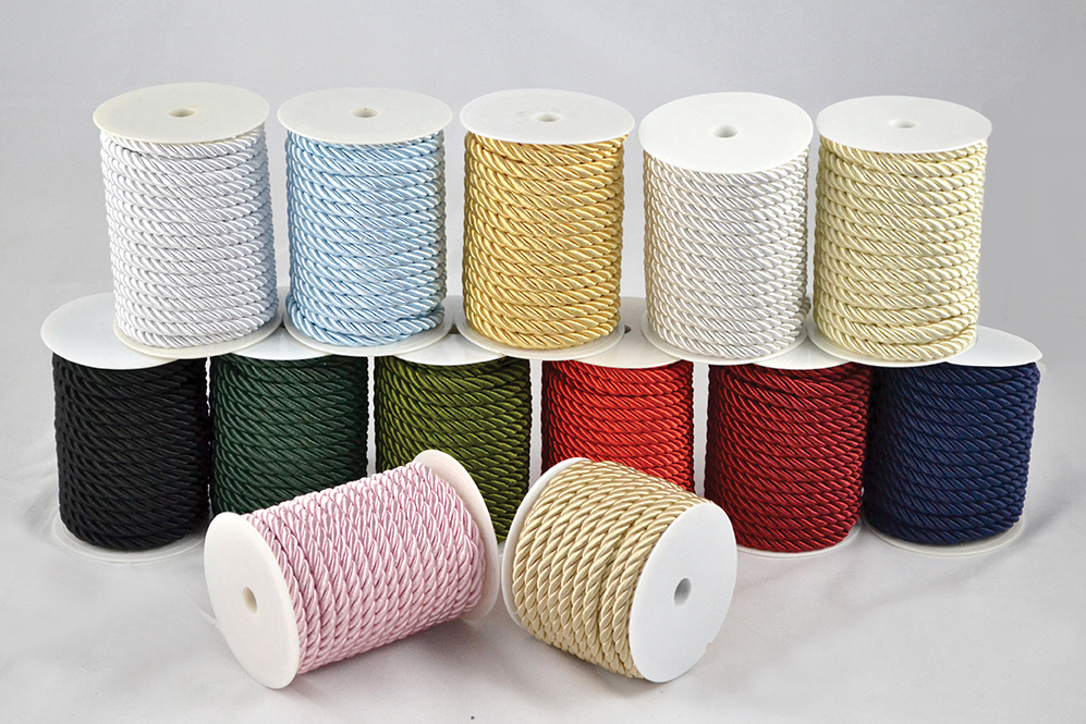 Κορδόνι πολυεστερικό μονόχρωμο τρίκλωνο σε ποικιλία χρωμάτων. Φάρδος: 9mm x 15m