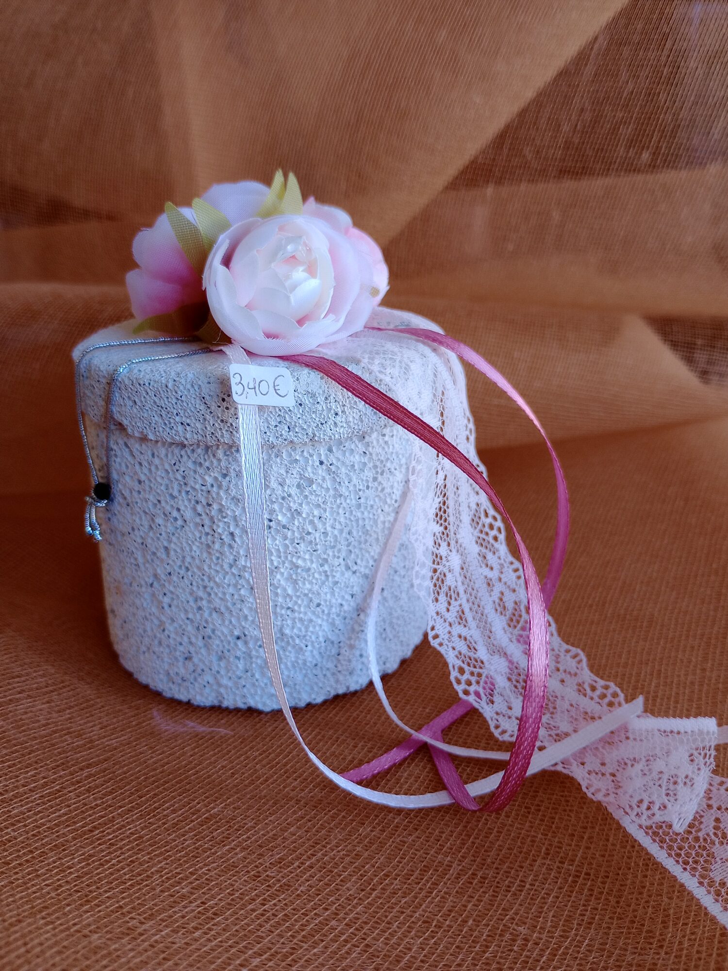 Ρομαντική και κομψή μπομπονιέρα από φυσική ελαφρόπετρα, σε ιδιαίτερο κυβικό σχήμα που αναδεικνύει τη μοναδική, πορώδη υφή του υλικού. Διακοσμημένη με εκλεπτυσμένη δαντέλα και σατέν κορδέλες σε απαλό ροζ και λευκό, που αγκαλιάζουν αρμονικά το σώμα της, ενώ στην κορυφή δεσπόζει ένα τρυφερό, ρεαλιστικό λουλούδι σε ροζ απόχρωση.