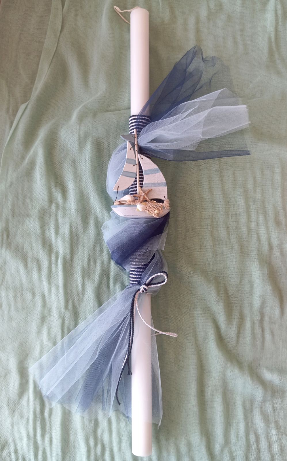 Λαμπάδα βάπτισης 90cm λευκή, στολισμένη, με θέμα τη θάλασσα. Τούλι λευκό και μπλε σκούρο καθώς και κορδόνι τρίκλωνο λευκό και μπλε σκούρο 1mm τυλιγμένα γύρω γύρω από τη λαμπάδα. Καραβάκι ξύλινο με κοχύλια και αστερία, κολλημένο στο κέντρο της λαμπάδας και μισός φιόγκος από κορδόνι τρίκλωνο λευκό και μπλε σκούρο 1mm κολλημένος στο κάτω μέρος της λαμπάδας. Το θέμα και ο στολισμός της λαμπάδας μπορεί να αλλάξει ανάλογα με τις προτιμήσεις σας, έπειτα από συνεννόηση μαζί μας.