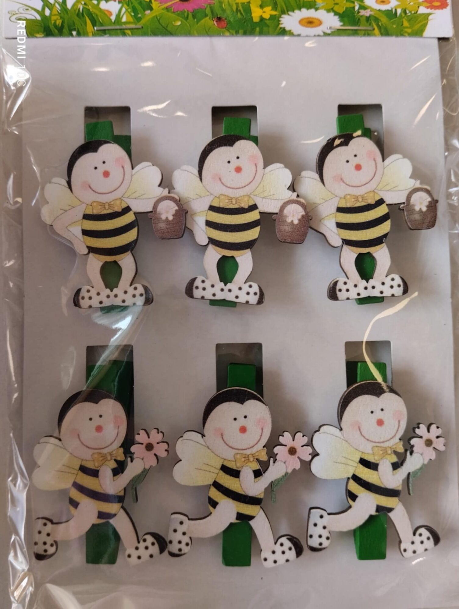 Μανταλάκι ξύλινο σε πράσινο χρώμα, με πασχαλίτσες που κρατούν καλαθάκι ή λουλούδι, για τη διακόσμηση του σπιτιού σας, ή και για να εμπλουτίσετε τις χειροτεχνίες σας. Πακέτο 6τμχ