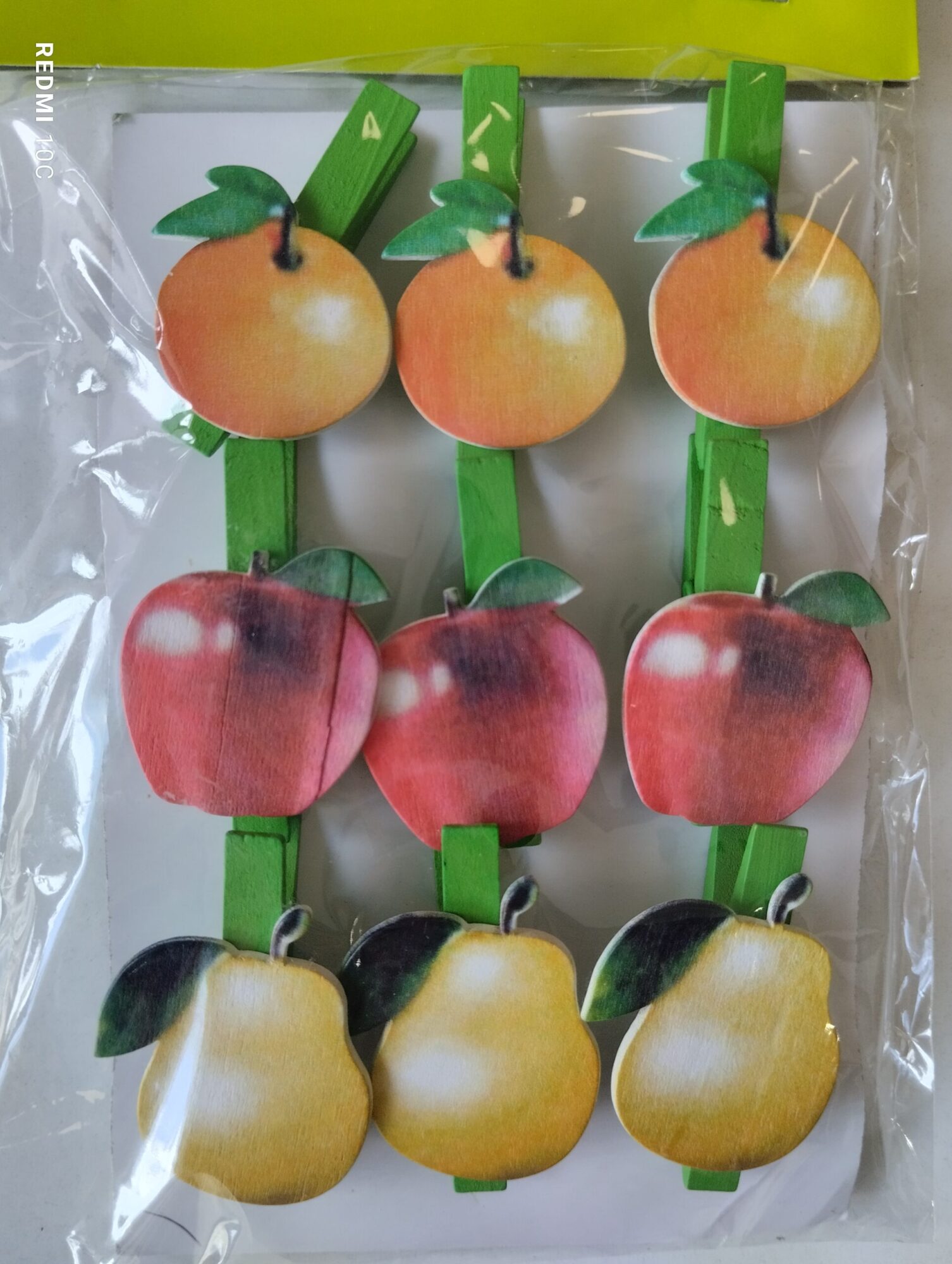 Μανταλάκι ξύλινο σε πράσινο χρώμα, με τρία διαφορετικά φρούτα για τη διακόσμηση του χώρου σας. Πακέτο 9τμχ