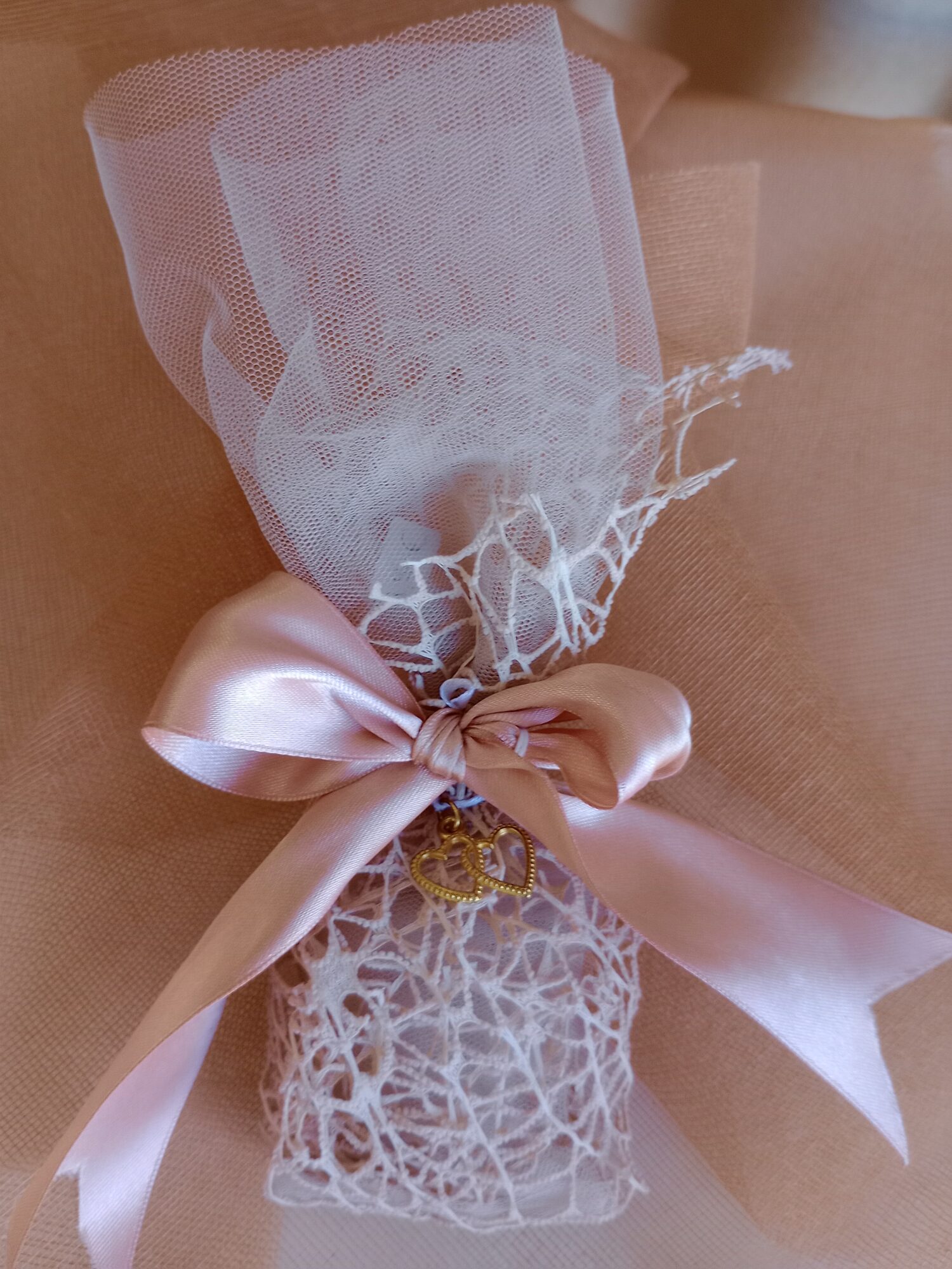 Το δέσιμο γίνεται με σατέν κορδέλα σε απαλή ροζ απόχρωση, που προσθέτει θηλυκότητα και ρομαντισμό, ενώ το μικρό μεταλλικό διακοσμητικό με διπλή καρδιά δίνει μια συμβολική και τρυφερή πινελιά αγάπης. Η αρμονική συνύπαρξη υφών και αποχρώσεων δημιουργεί μια κομψή και ιδιαίτερα καλαίσθητη μπομπονιέρα.