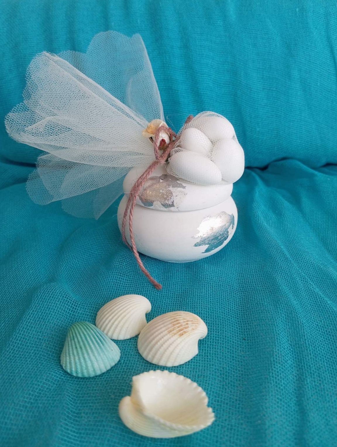 Μπομπονιέρα γάμου κεραμικό μπολάκι με καπάκι, λευκό, με ασημί λεπτομέρειες, δεμένο τούλι με κορδόνι γιούτα σε σάπιο μήλο και κουφέτα Χατζηγιαννάκη γεύσεις, τυλιγμένα σε λευκό τούλι συννεφάκι. Μια υπέροχη καλοκαιρινή ανάλαφρη επιλογή που θυμίζει κάτι από νησί.