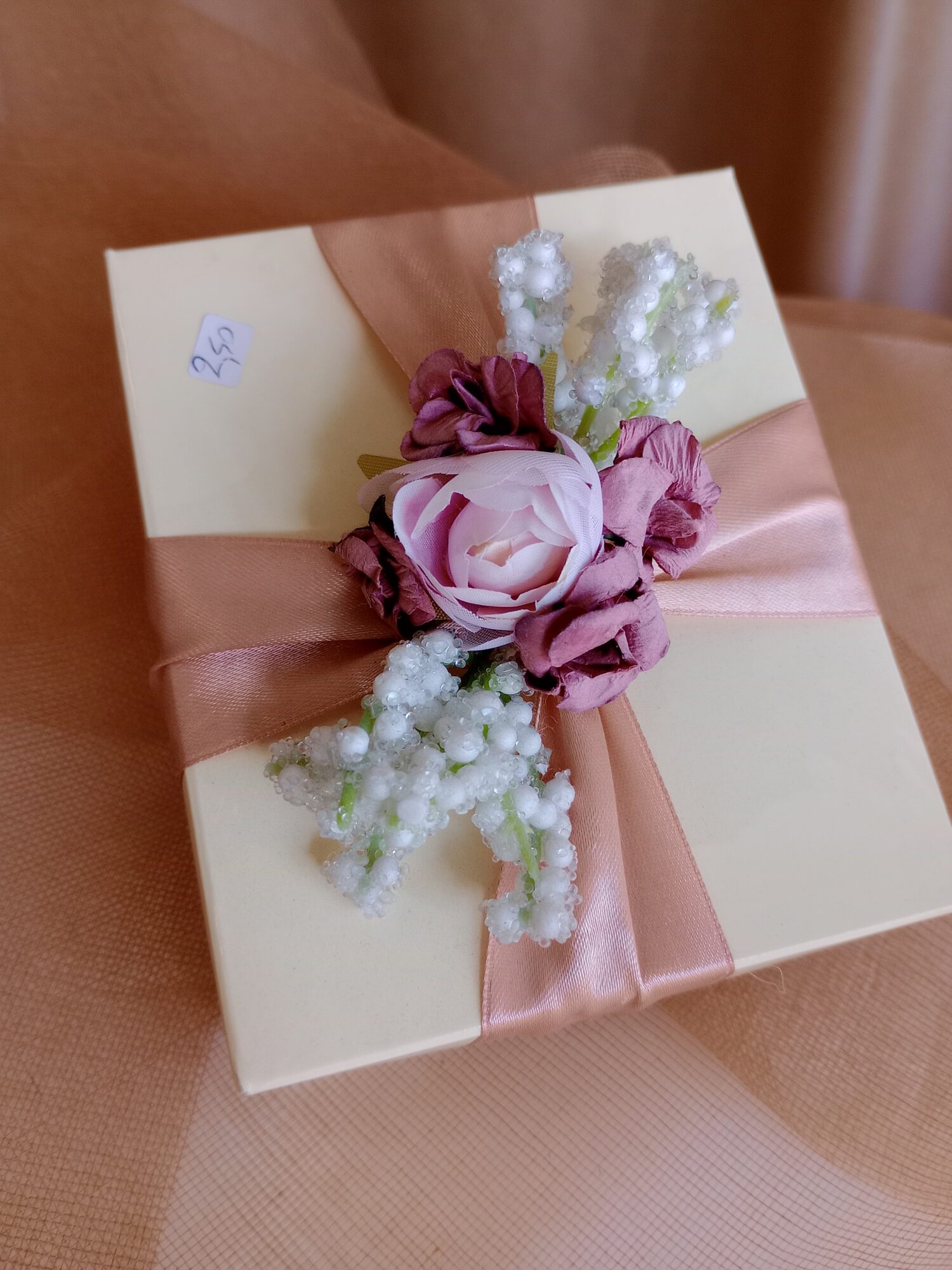Ρομαντική και εκλεπτυσμένη μπομπονιέρα σε κομψό, τετράγωνο κουτί σε απαλή ιβουάρ απόχρωση, που αποπνέει διαχρονική φινέτσα. Η σατέν κορδέλα σε ροδακινί–σομόν τόνο αγκαλιάζει αρμονικά το κουτί, δημιουργώντας μια ζεστή και ιδιαίτερα κομψή βάση για τη σύνθεση.