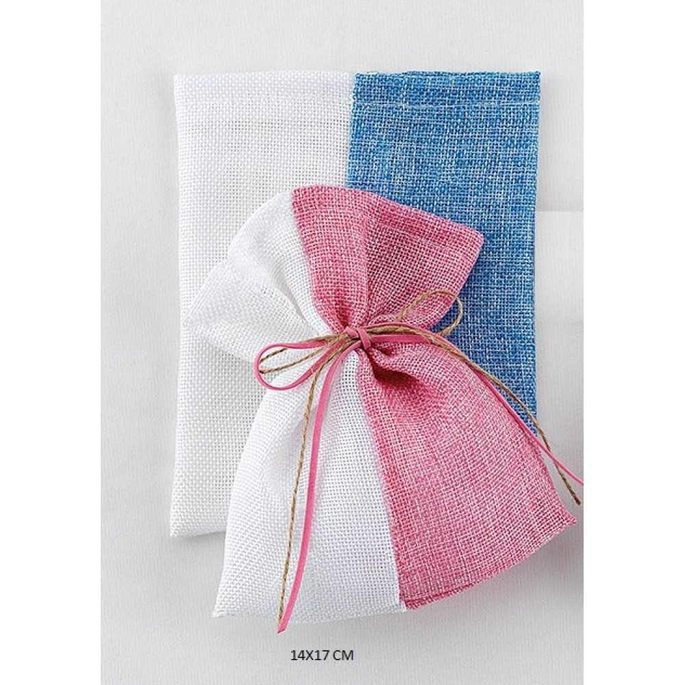 Πουγκί υφασμάτινο δίχρωμο, φτιαγμένο από λευκό & χρωματιστό καμβά. Διαθέσιμα χρώματα: ροζ / σιέλ. Κομψή και πρωτότυπη μπομπονιέρα για ιδιαίτερες και εντυπωσιακές βαπτίσεις.Διαστάσεις: 14×17 cm