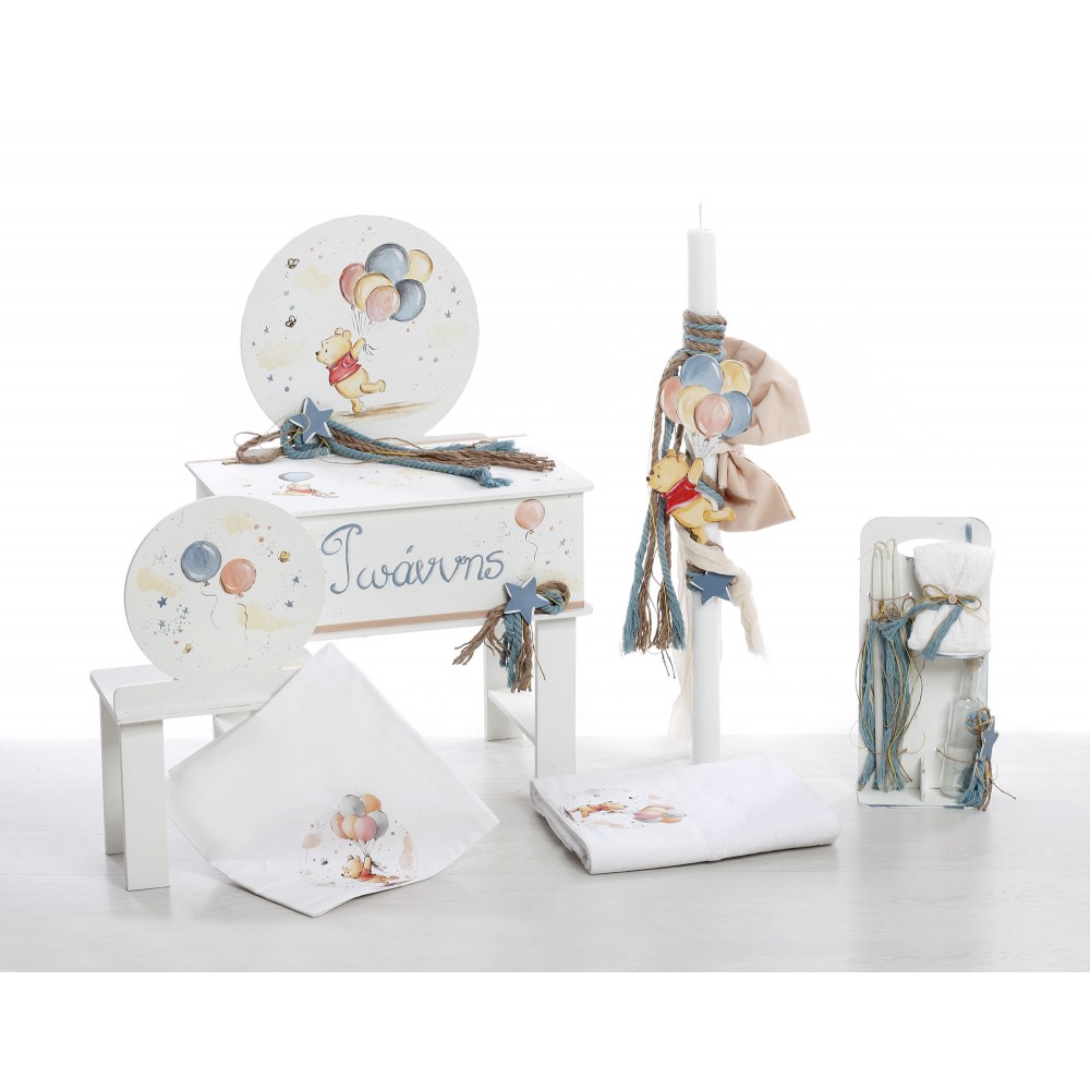 Ολοκληρωμένο βαπτιστικό σετ με θέμα τον Winnie the Pooh, διακοσμημένο με χειροποίητη ζωγραφική σε γήινες και παστέλ αποχρώσεις. Μια χαριτωμένη και διαχρονική επιλογή για μια γλυκιά βάπτιση.