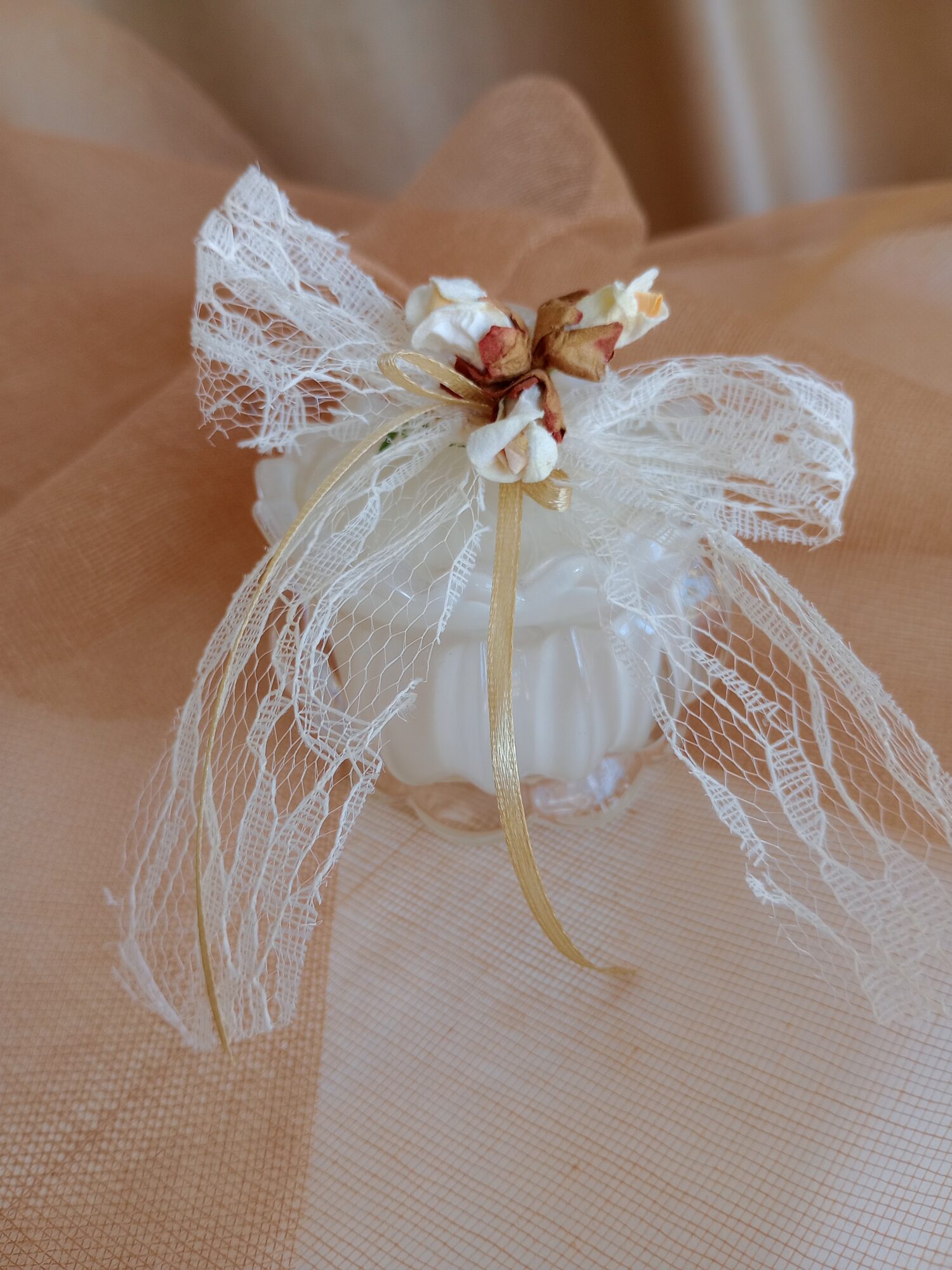 Κομψή και διαχρονική γυάλινη φοντανιέρα, με ανάγλυφο, καμπυλωτό σχεδιασμό που αποπνέει ρομαντική φινέτσα. Η λαμπερή, διάφανη υφή του γυαλιού αναδεικνύει την καθαρότητα και την εκλεπτυσμένη αισθητική της, ενώ η διακόσμηση με αέρινο τούλι σε εκρού απόχρωση και φίνα χρυσή κορδέλα προσθέτει μια διακριτική πινελιά πολυτέλειας.