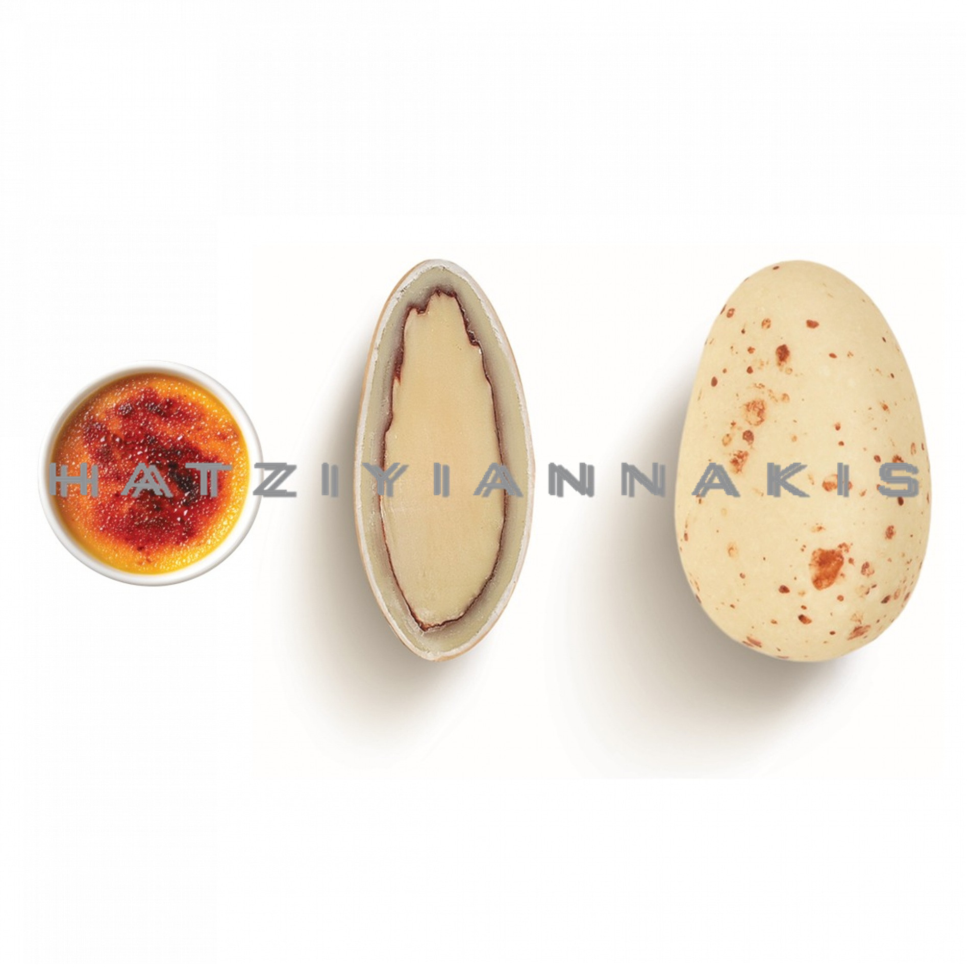 Ολόκληρο καβουρδισμένο αμύγδαλο και λευκή σοκολάτα με λεπτή επικάλυψη ζάχαρης, γεύση creme brulee.